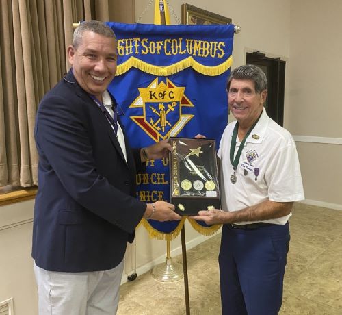 Grand Knight, Rick Kuertz, presents former Grand Knight, Ron Bowes the Star Council Award for 2023.