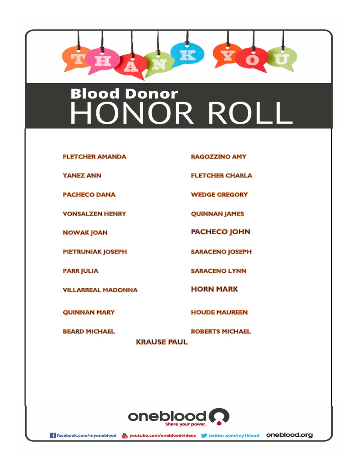 Great turnout on May 19th! One Blood and I, as the new Chairperson, want to thank you for all you did to help make this blood drive a success. Easter was early this year, as such the Snowbirds left early, and donations are way off creating a critical shortage right now.