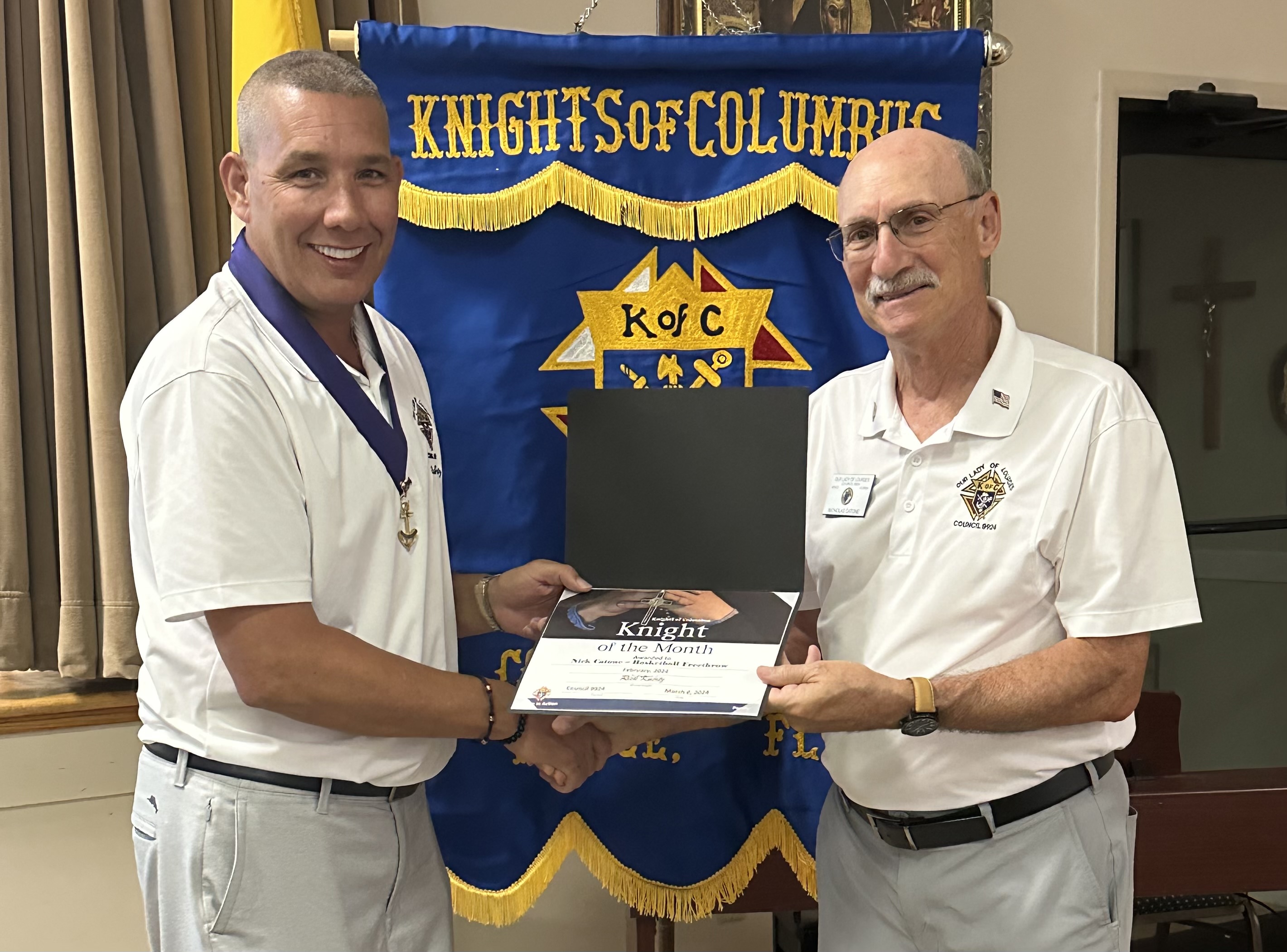 Grand Knight, Rick Kuertz, presents Nick Catone with Knight of the Month Award for February 2024