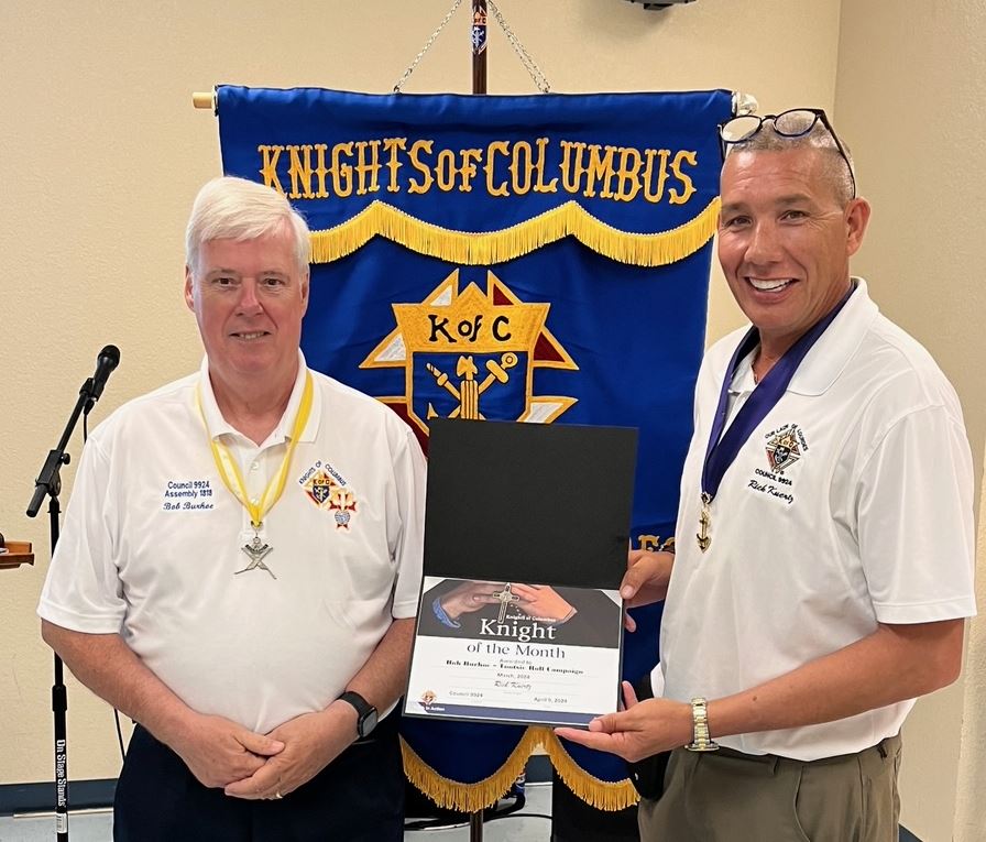 At the meeting on Aug. 14th Grand Knight Rick Kuertz presented Bob Burhoe Knight of the Month for March 2024 for his work on the Tootsie Roll Drive