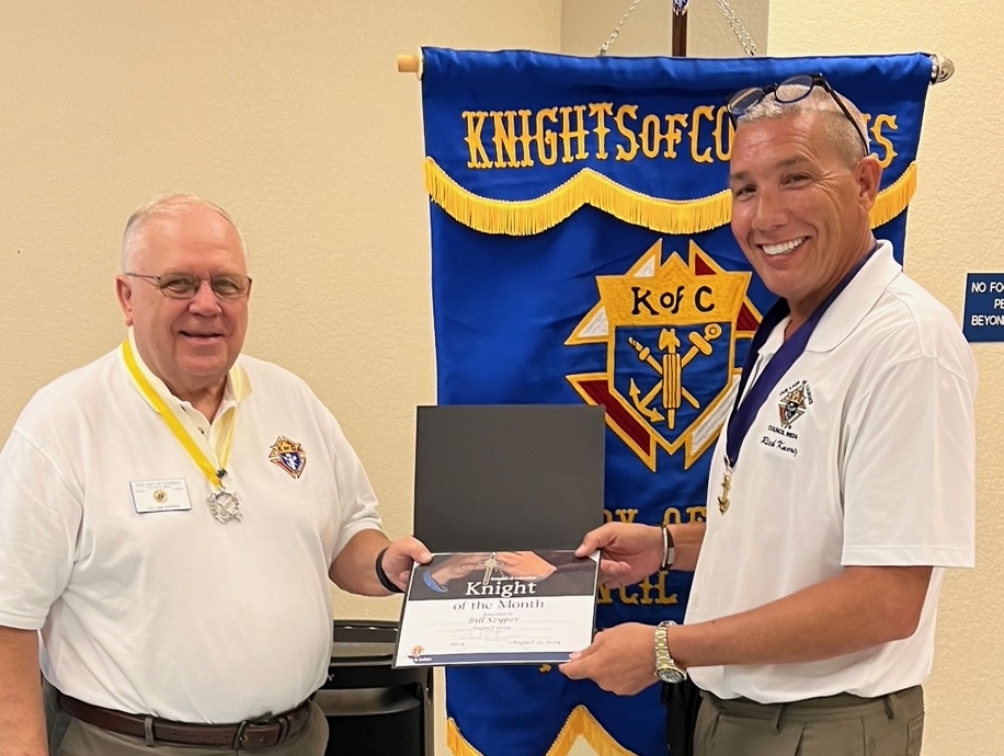 Grand Knight Rick Kuertz of Council 9924 presents Bill Szyper Knight of the Month for August 2024