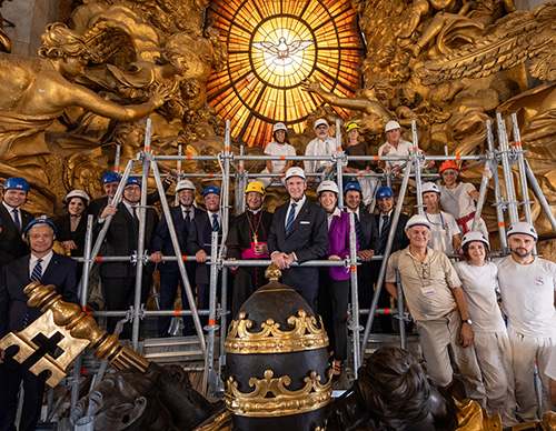 Supreme Knight Patrick Kelly, his wife, Vanessa, and other K of C leaders gather Oct. 24 at the top of the Altar of the Chair of St. Peter with some of the experts who are now restoring the altarpiece with support from the Knights. (Photo by Tamino Petelinšek)
