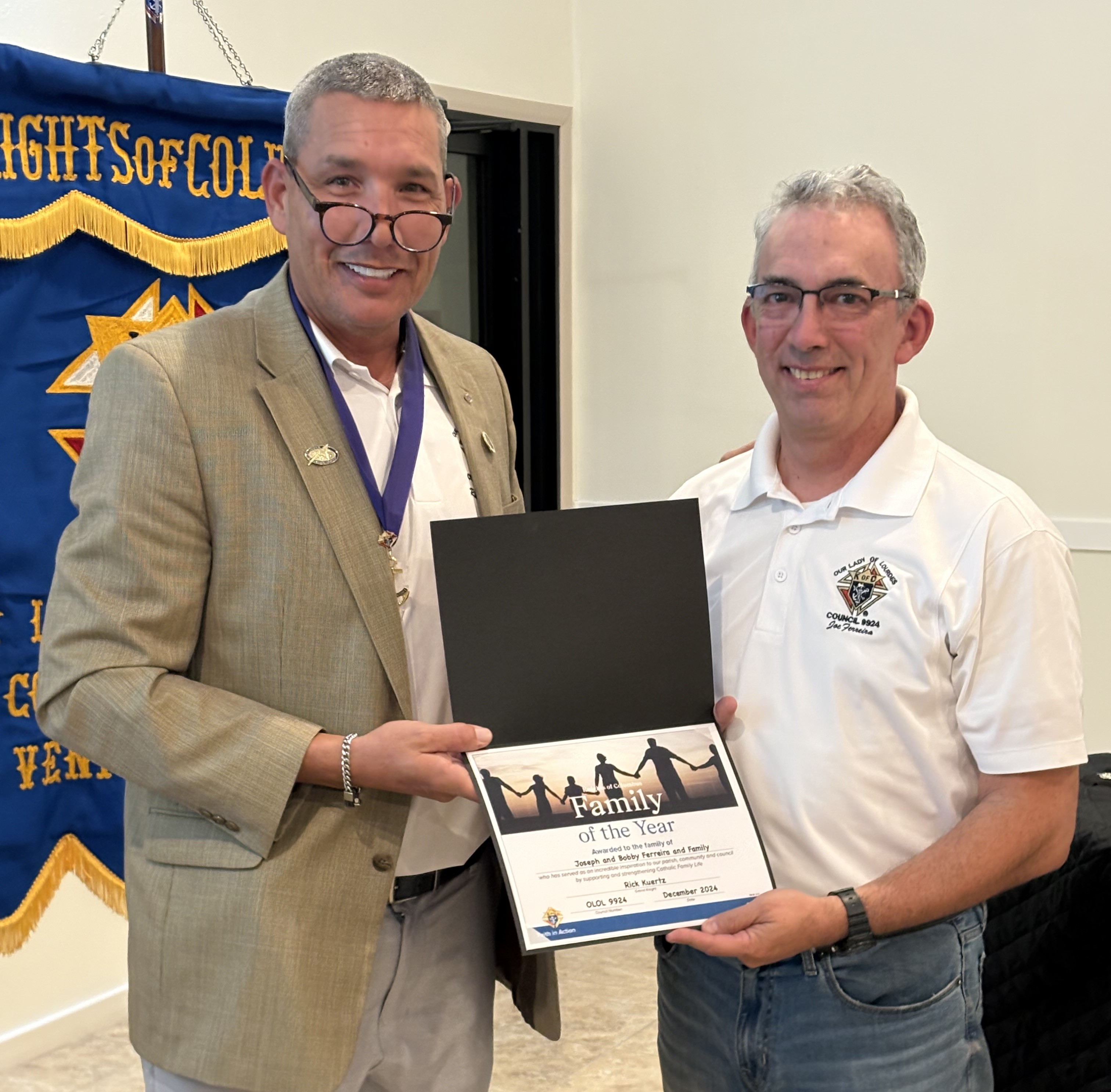 Rick Kuertz the Grand Knight presents Joe Ferreira family the family of the year award for 2024