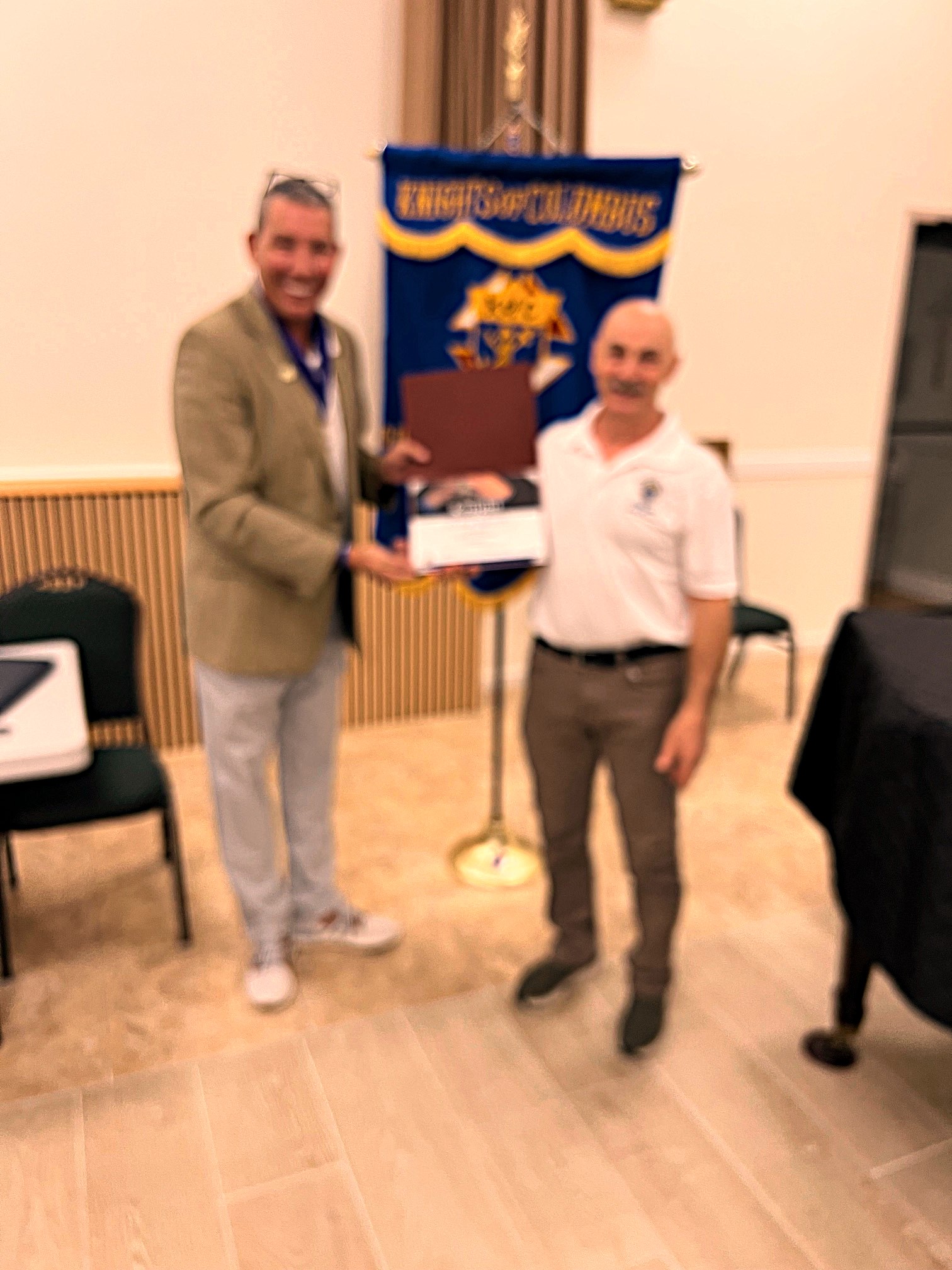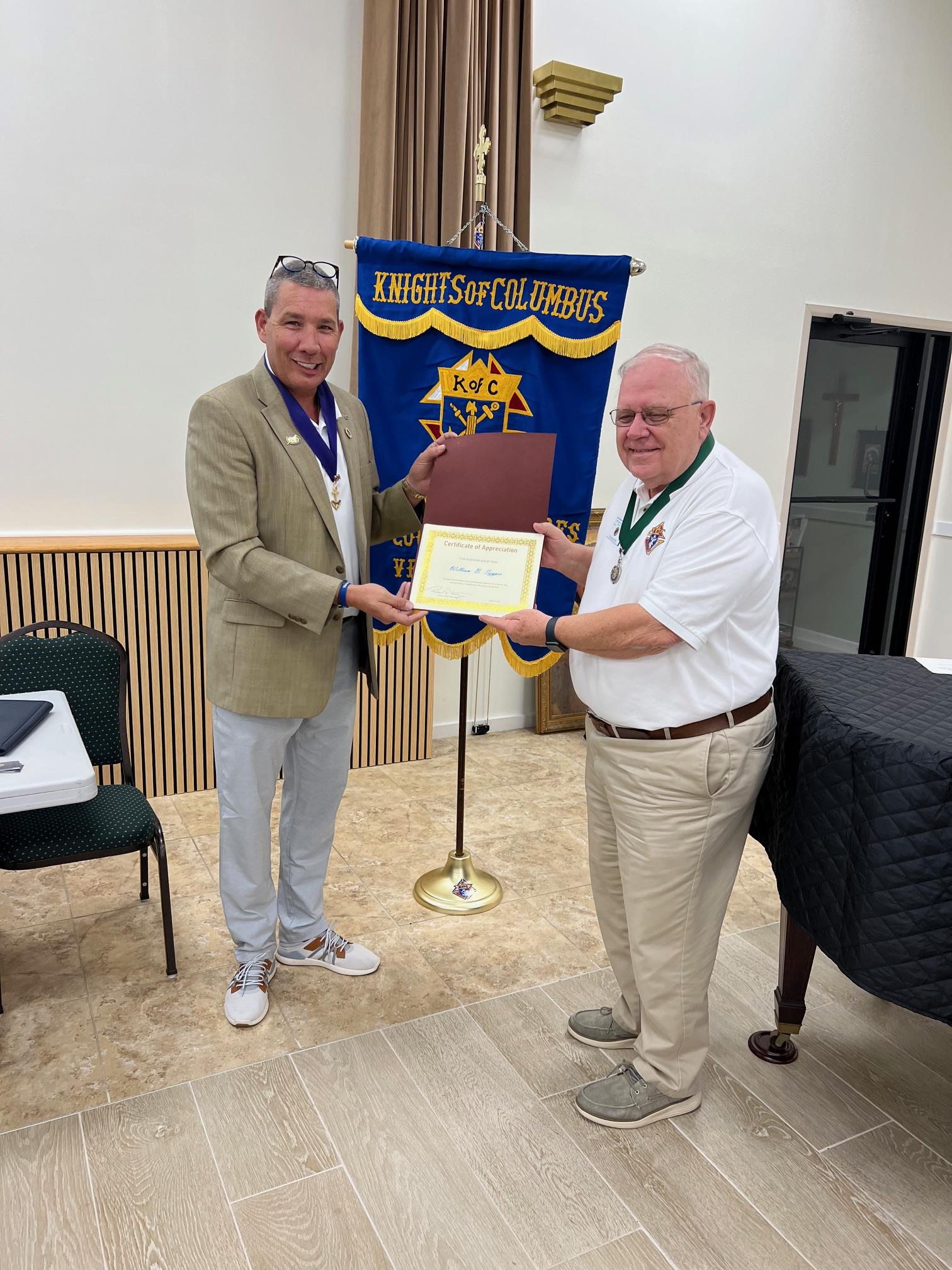 Grand Knight Rick Kurtz of Council 9924 presents Bill Szyper and John Priscio with January 2025 Appreciation Awards
