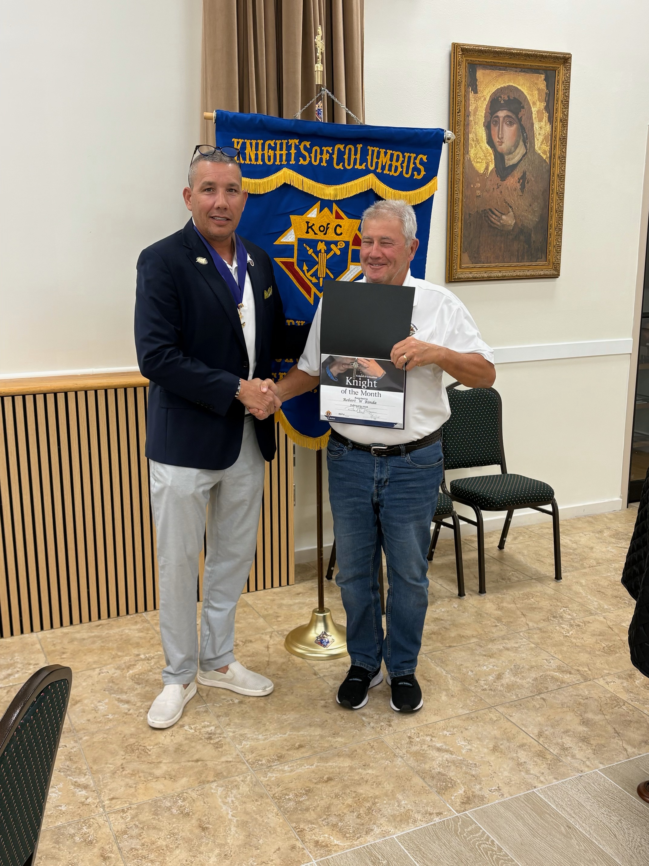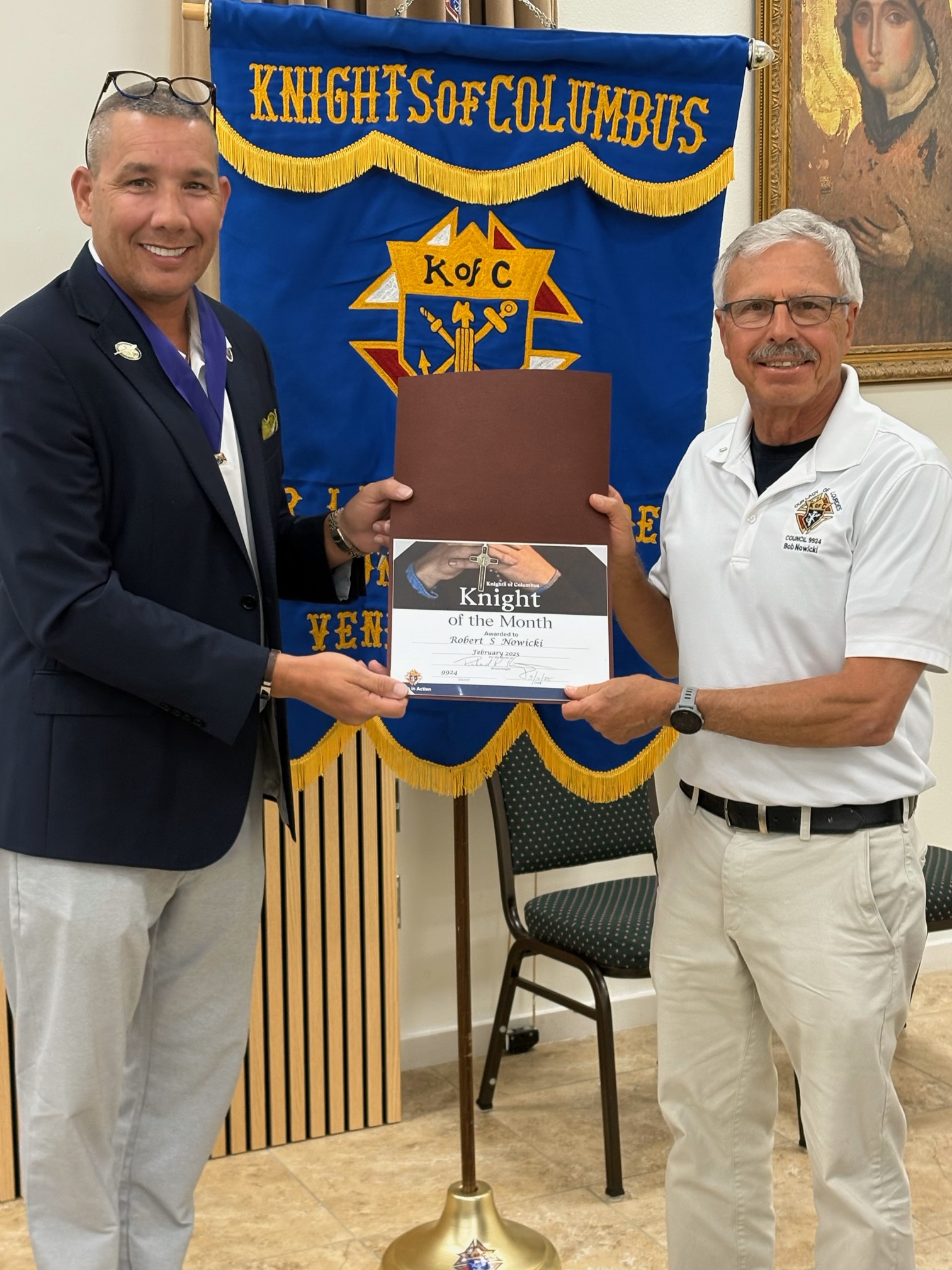 Grand Knight Rick Kurtz of Council 9924 presents Bob Nowicki and Bob Rinda with February 2025 Co-Knight of the Month Awards