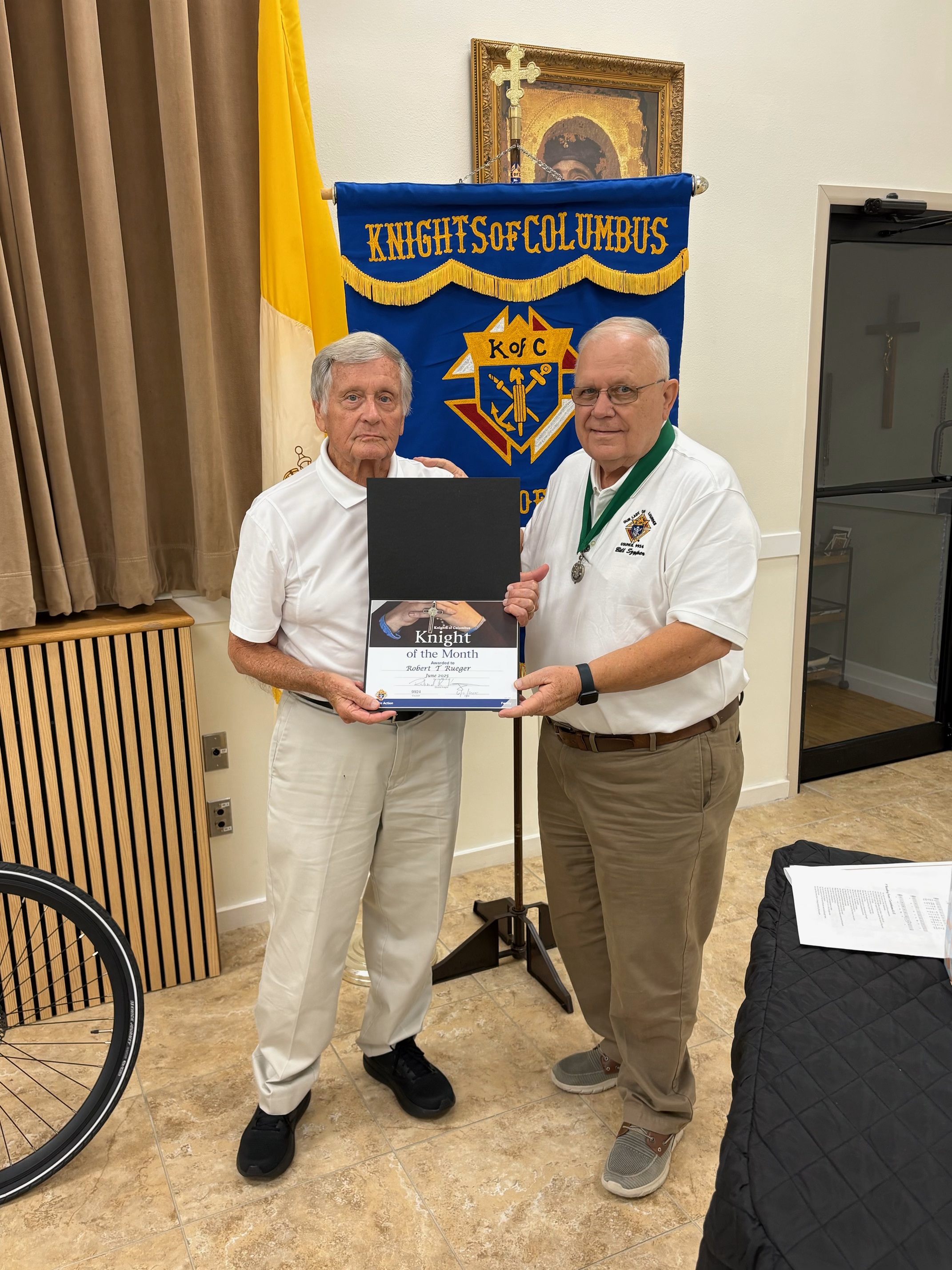 Acting Grand Knight Bill Szyper presents Bob Rueger with the June, 2025 Knight of the Month Award in recognition of his years of service as Council 9924 Treasurer.