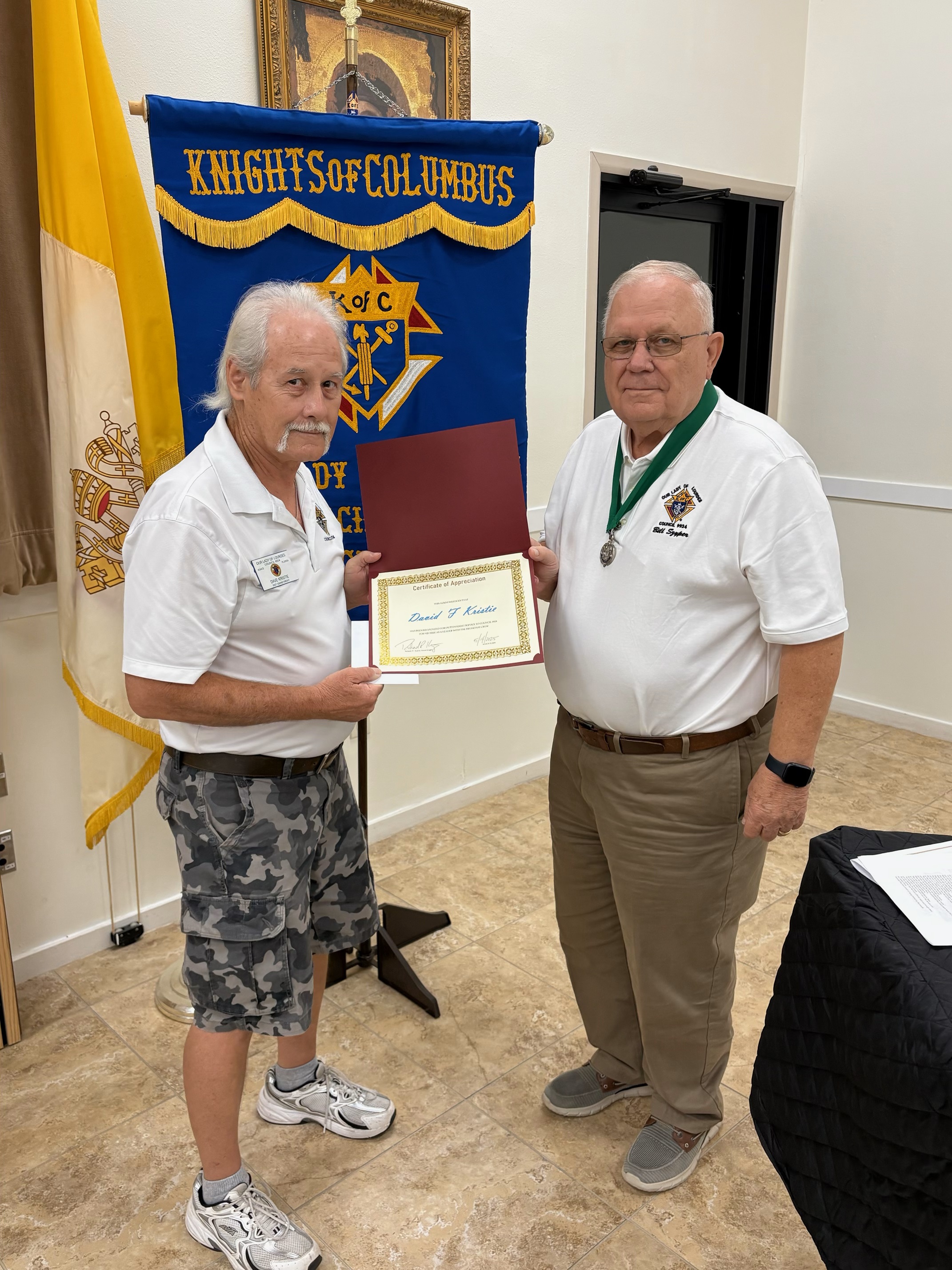 At the 6/11/2025 Council 9924 Membership Meeting acting Grand Knight Bill Szyper presents Dave Kristie with an an appreciation award in recognition of Dave's service leading the Pancake Breakfast crew over the past several years. Thank you Dave for your tireless service to our council in this significant fundraiser.