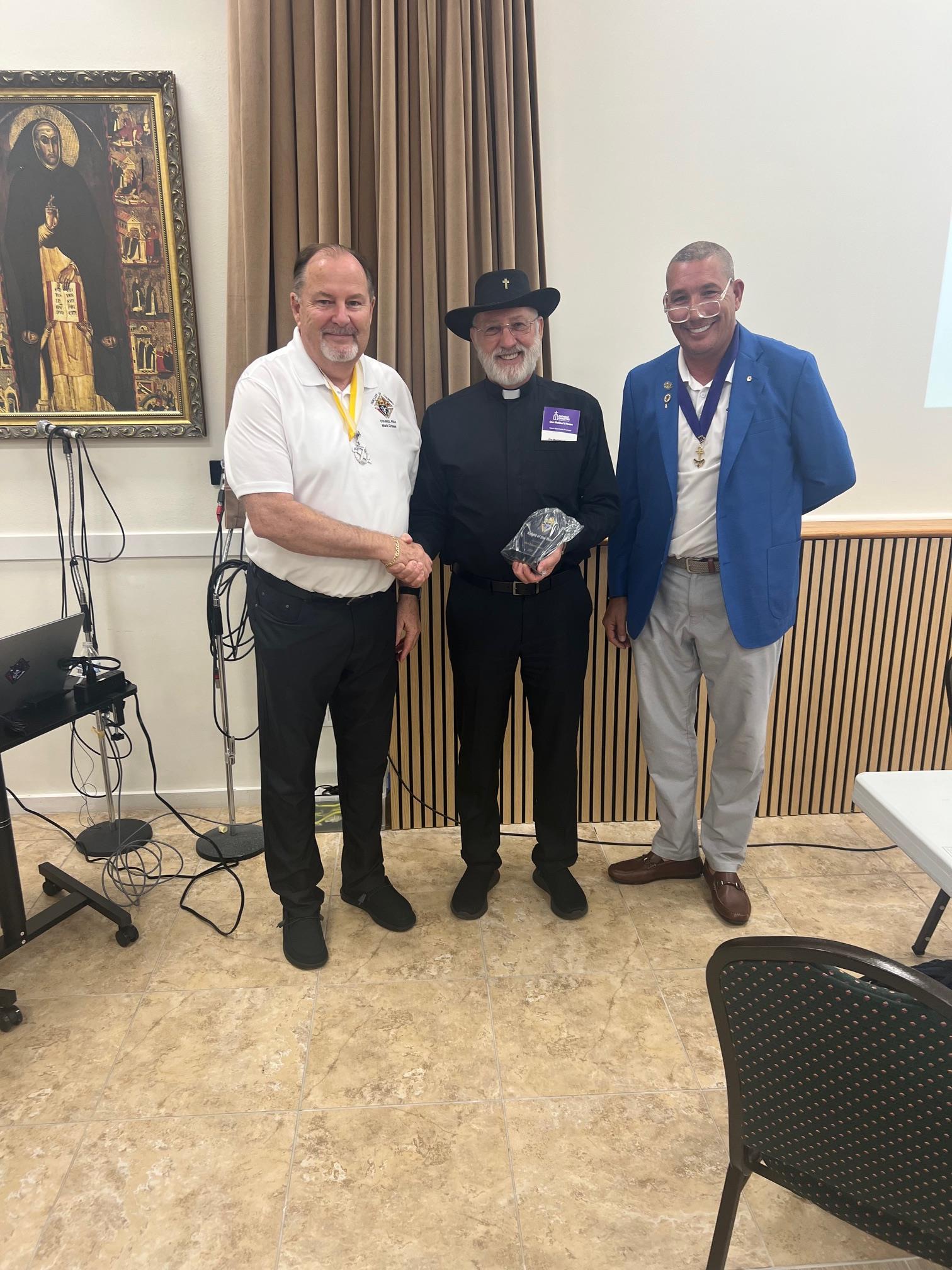 Council 9924 Grand Knight Rick Kuertz & Our Lady of Lourdes Pastor Rev. Jay Jancarz present Mark Crews 2024-2025 Knight of the Year Award