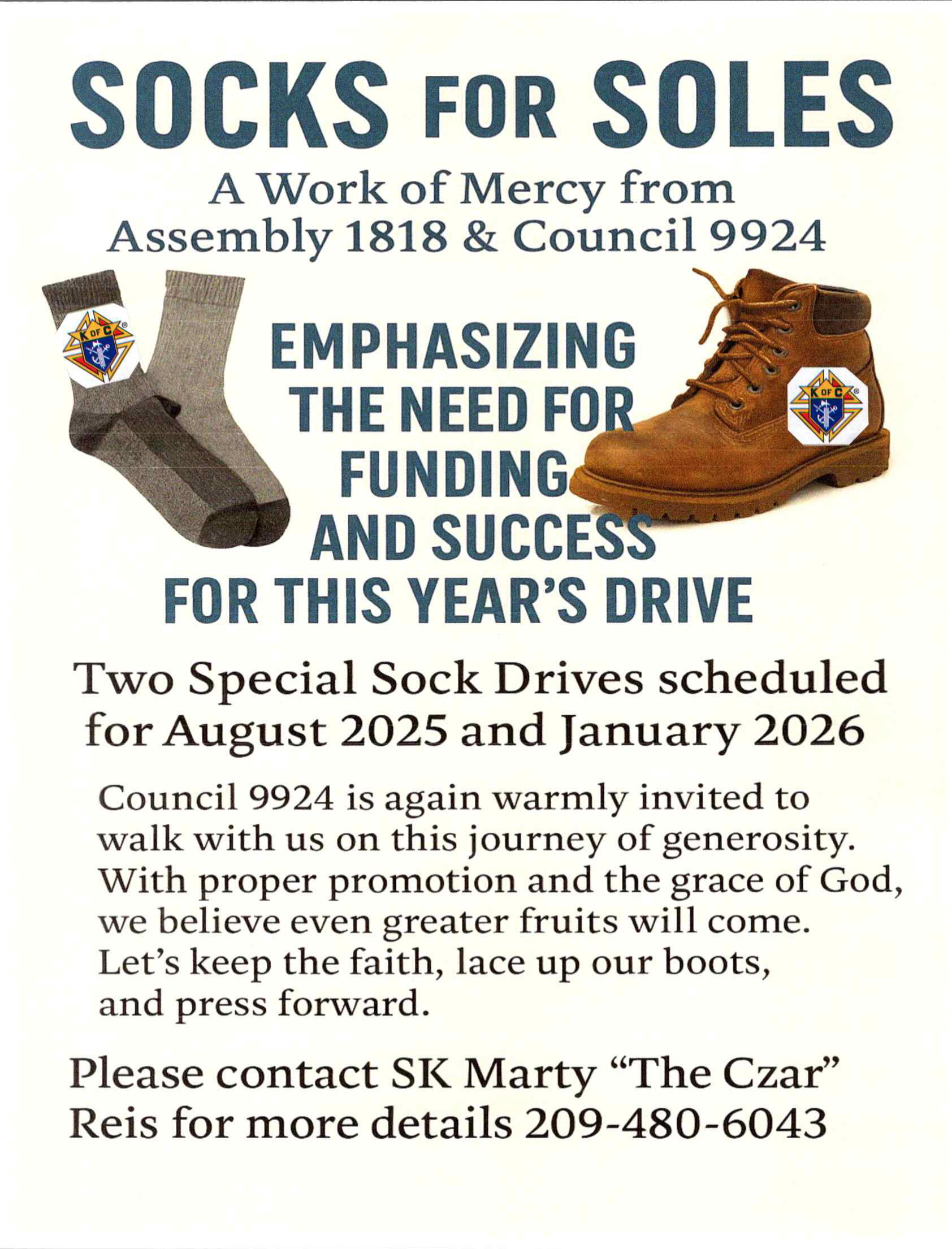 This month, Assembly 1818 and Council 9924 will both collect socks for seasonal migrant workers at their monthly meetings. We warmly invite every Sir Knight and Brother Knight to participate with the same enthusiasm shown in last year's drive during which, under the steady hand of our Sock Czar, SK Marty Reis, we collected more than 12,000 pairs of socks.
