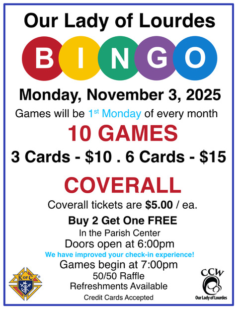 The Knights of Columbus Council 9924 are proud to partner with the Council of Catholic Women to bring the fun and fellowship of Bingo to Our Lady of Lourdes Church this Fall.  Join us the first Monday of each month for community spirit, friendly competition, and a chance to support local causes!
